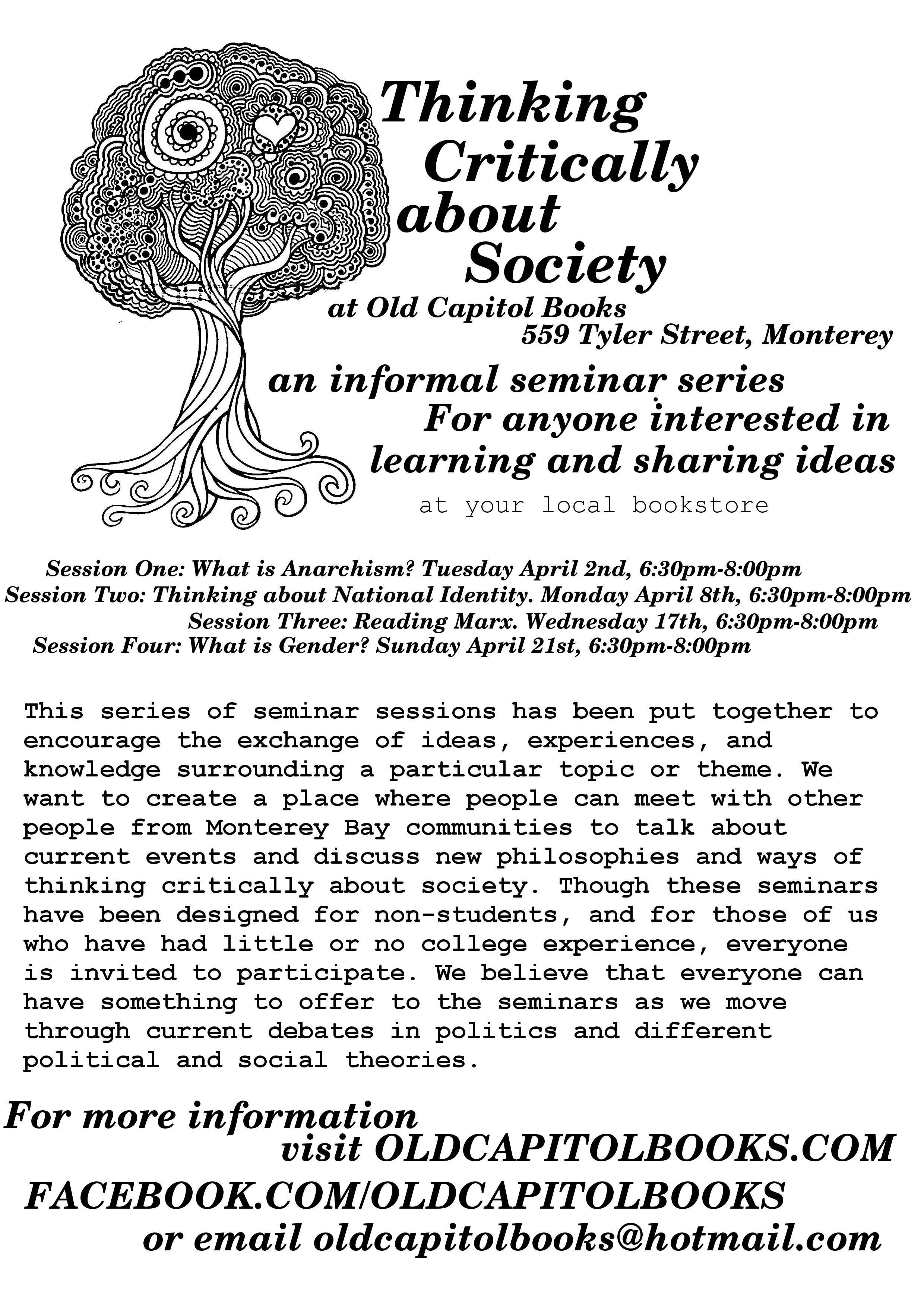 This series of seminar sessions has been put together to encourage the exchange of ideas, experiences, and knowledge surrounding a particular topic or theme. We want to create a place where people can meet with other people from Monterey Bay communities to talk about current events and discuss new philosophies and ways of thinking critically about society. Though these seminars have been designed for non-students, and for those of us who have had little or no college experience, everyone is invited to participate. We believe that everyone can have something to offer to the seminars as we move through current debates in politics and different political and social theories.