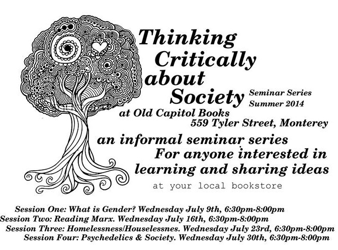 For four weeks in July, local activists and community educators will come together to bring philosophy and political & social theory to the downtown Monterey community, addressing some pressing issues that face our town and that affect the people who live here. The seminars are: