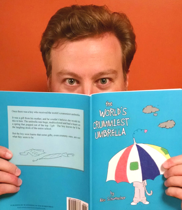 Alex Schumacher is an author-illustrator who grew up in the “Salad Bowl of the World” surrounded by fields, family and a passion for storytelling. During a stint in the Bay Area of California, Alex became involved with both the regional chapter of the National Cartoonist Society and the Cartoon Art Museum. Through both organizations he was able to meet and learn from many talented professionals. Shortly thereafter, Alex began to find work in the comic book industry and has worked with noted publishers Viper Comics, Arcana Studios and Bluewater Productions. Currently he is focusing on children’s literature and developing animated series. Through Wandering in the Words Press, Alex brings to you The World’s Crummiest Umbrella.