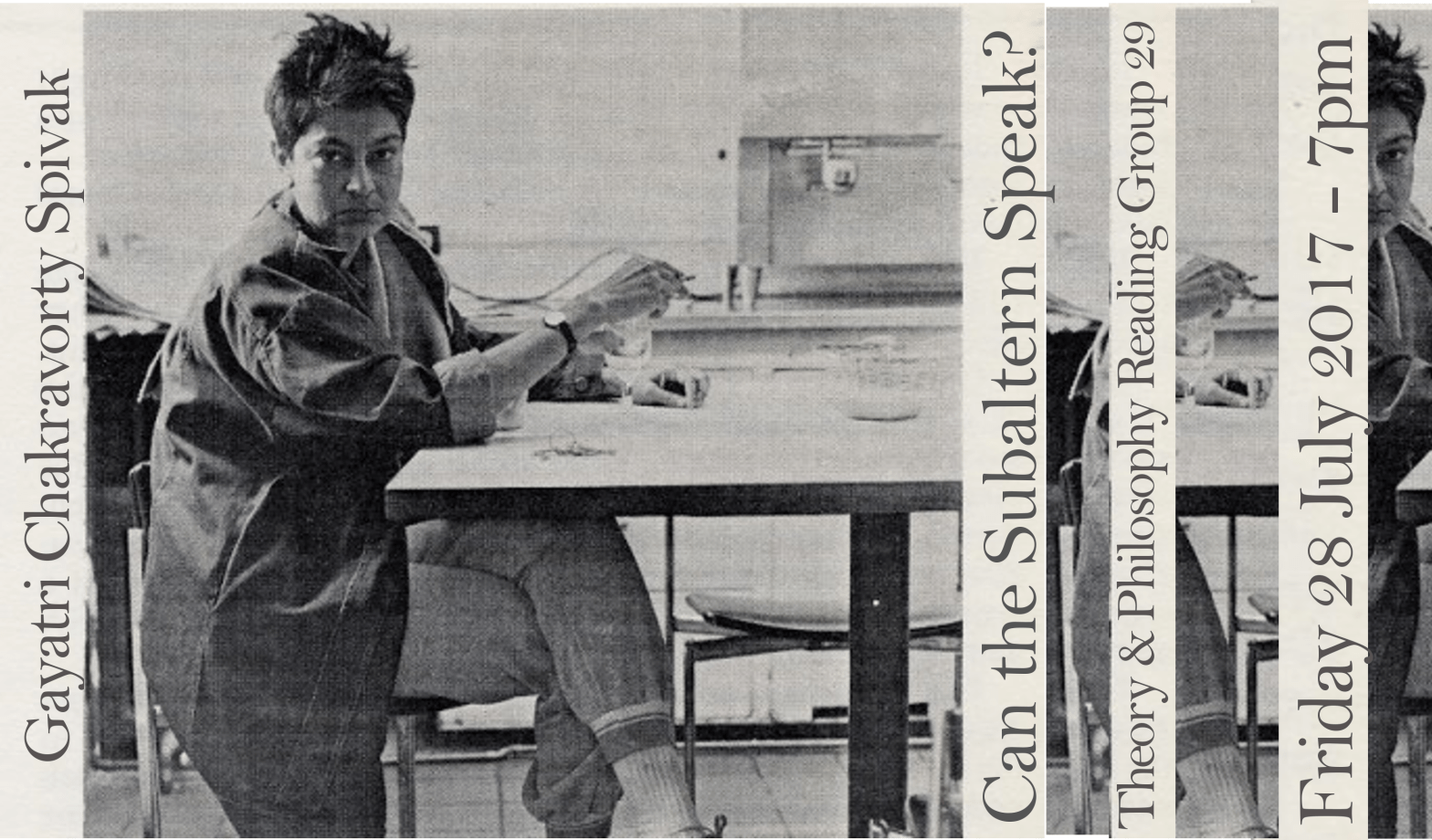 Friday 28 July 2017, 7pm: The Theory & Philosophy Reading Group will explore an essay which was written in response to the Deleuze and Foucault conversation that we read earlier this year: Gayatri Chakravorty Spivak’s “Can the Subaltern Speak?” (1988).