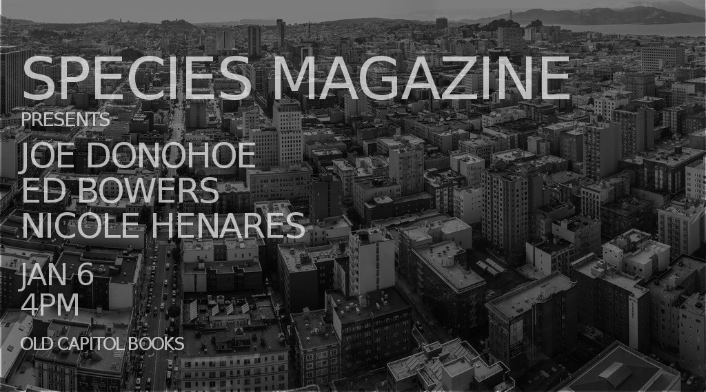 Saturday 6 January 2018, 4-6pm: Species magazine poets and writers will appear at Old Capitol Books this coming reading to read their stories, poems, and other writings. This Species reading will feature Joe Donohoe, Zen priest Ed Bowers, and Nicole Henares (Aurelia Lorca).