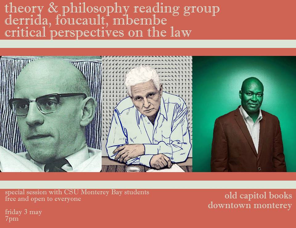 Come join our regular reading group for a special session featuring seniors at CSU Monterey studying critical legal philosophy. The normal reading group will be joined by these students for a conversation exploring the works of Michel Foucault, Achille Mbembe, and Jacques Derrida.